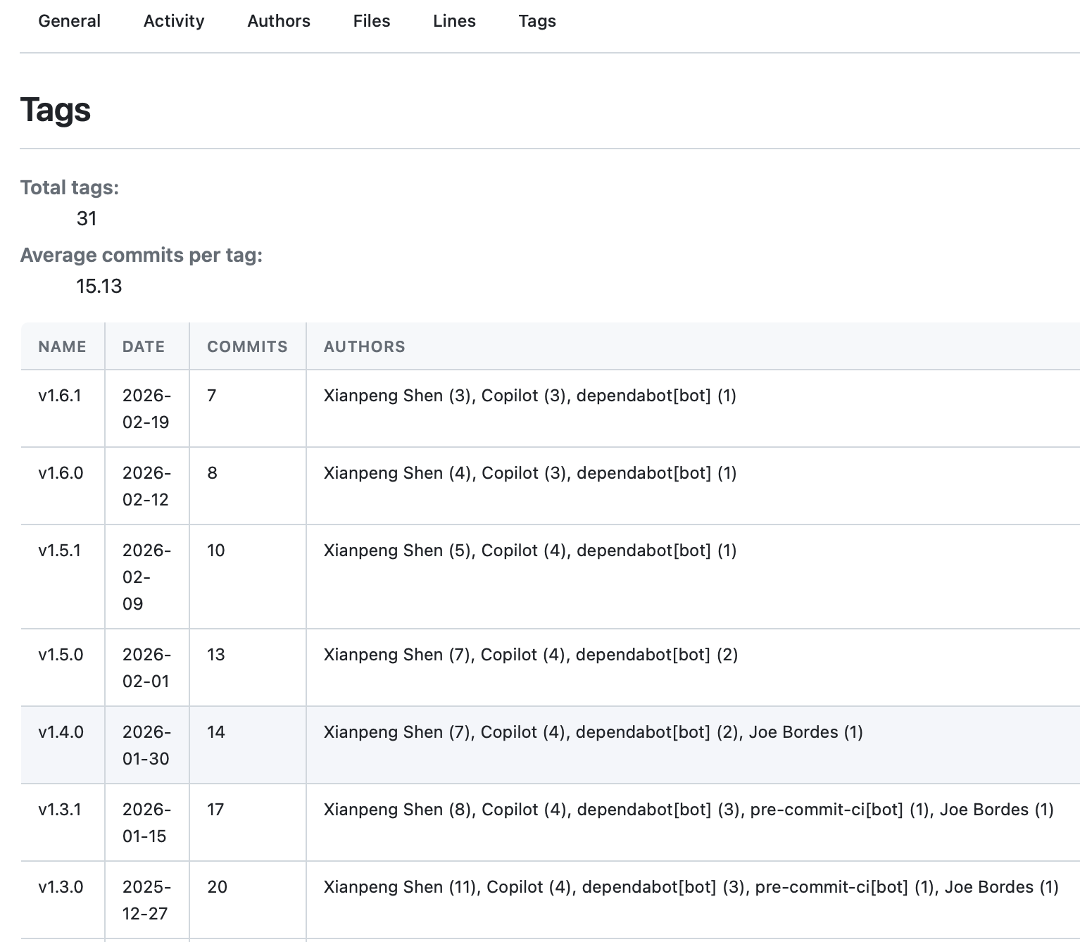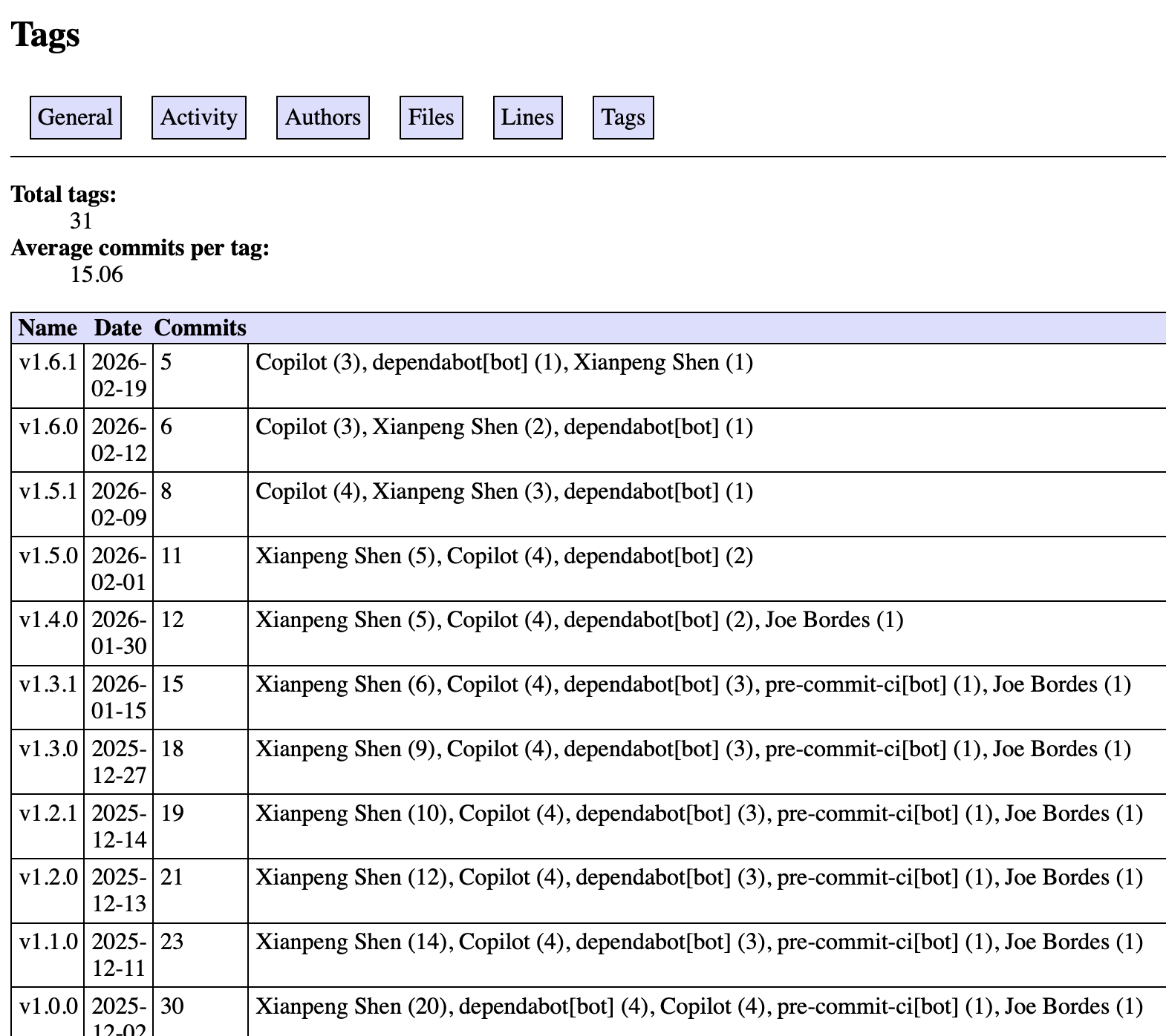gitstats . reportThe generated report includes these dimensions: General (Overview), Activity (Activity Heatmap), Authors (Contributor Statistics), Files (File Trends), Lines (Code Line Changes), Tags (Version Timeline).
