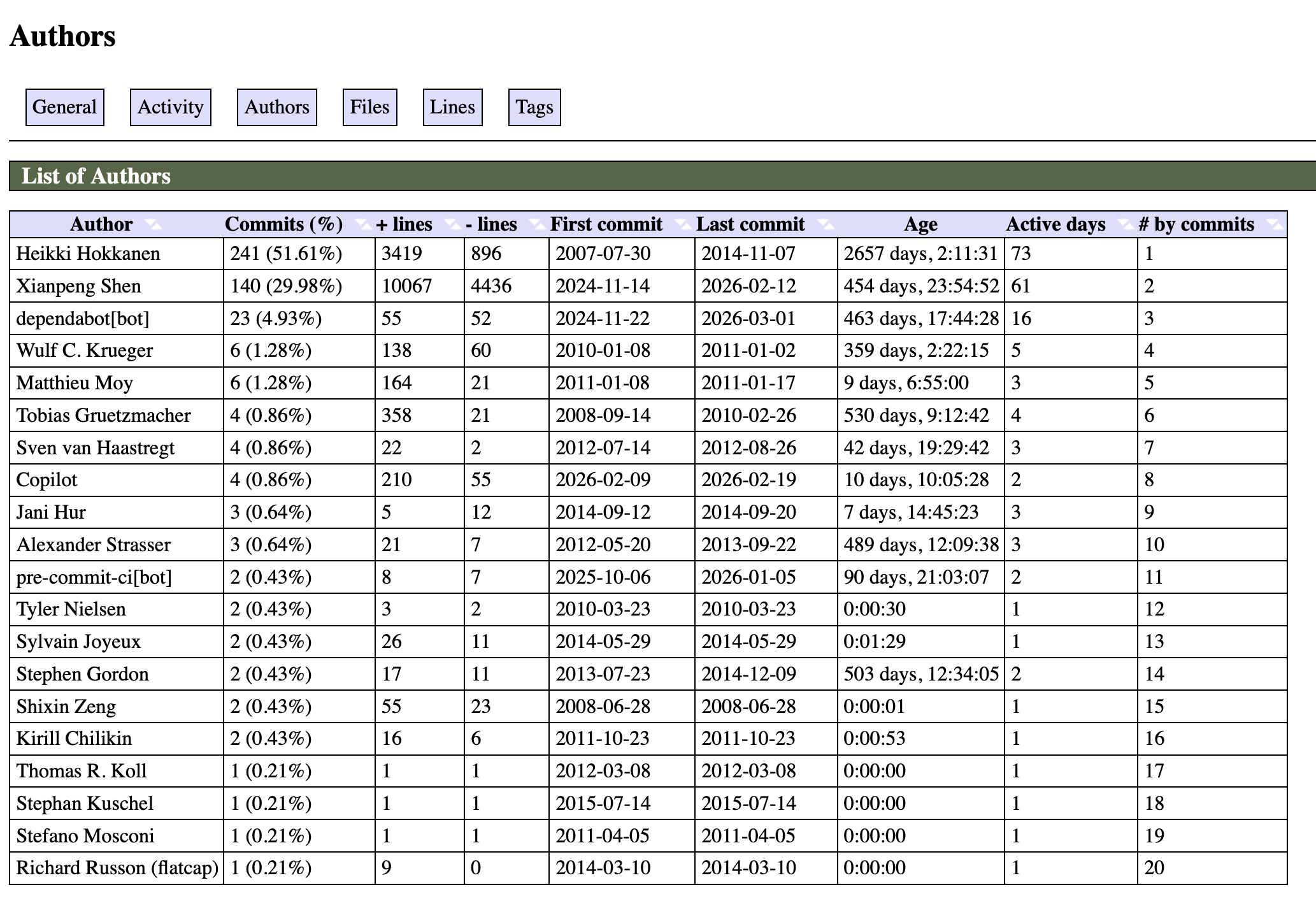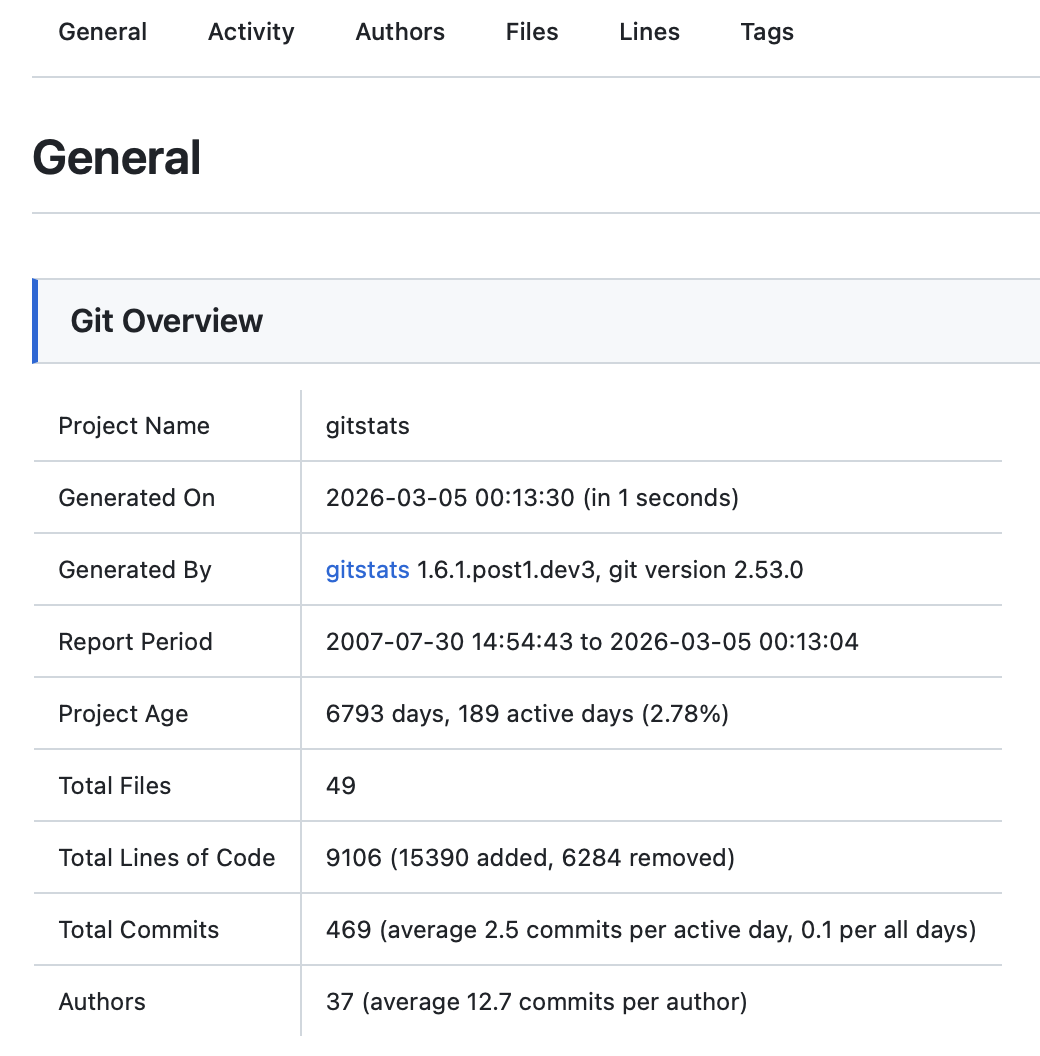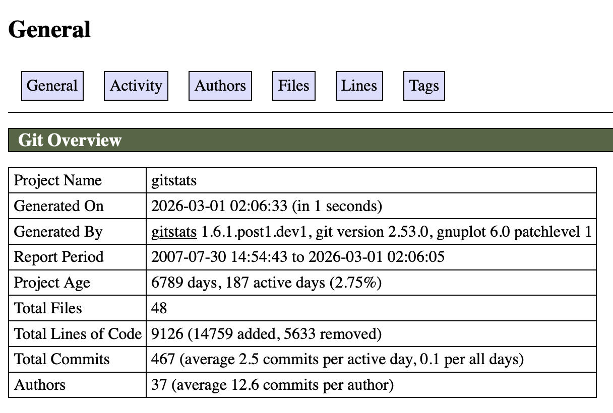 gitstats . reportThe generated report includes these dimensions: General (Overview), Activity (Activity Heatmap), Authors (Contributor Statistics), Files (File Trends), Lines (Code Line Changes), Tags (Version Timeline).