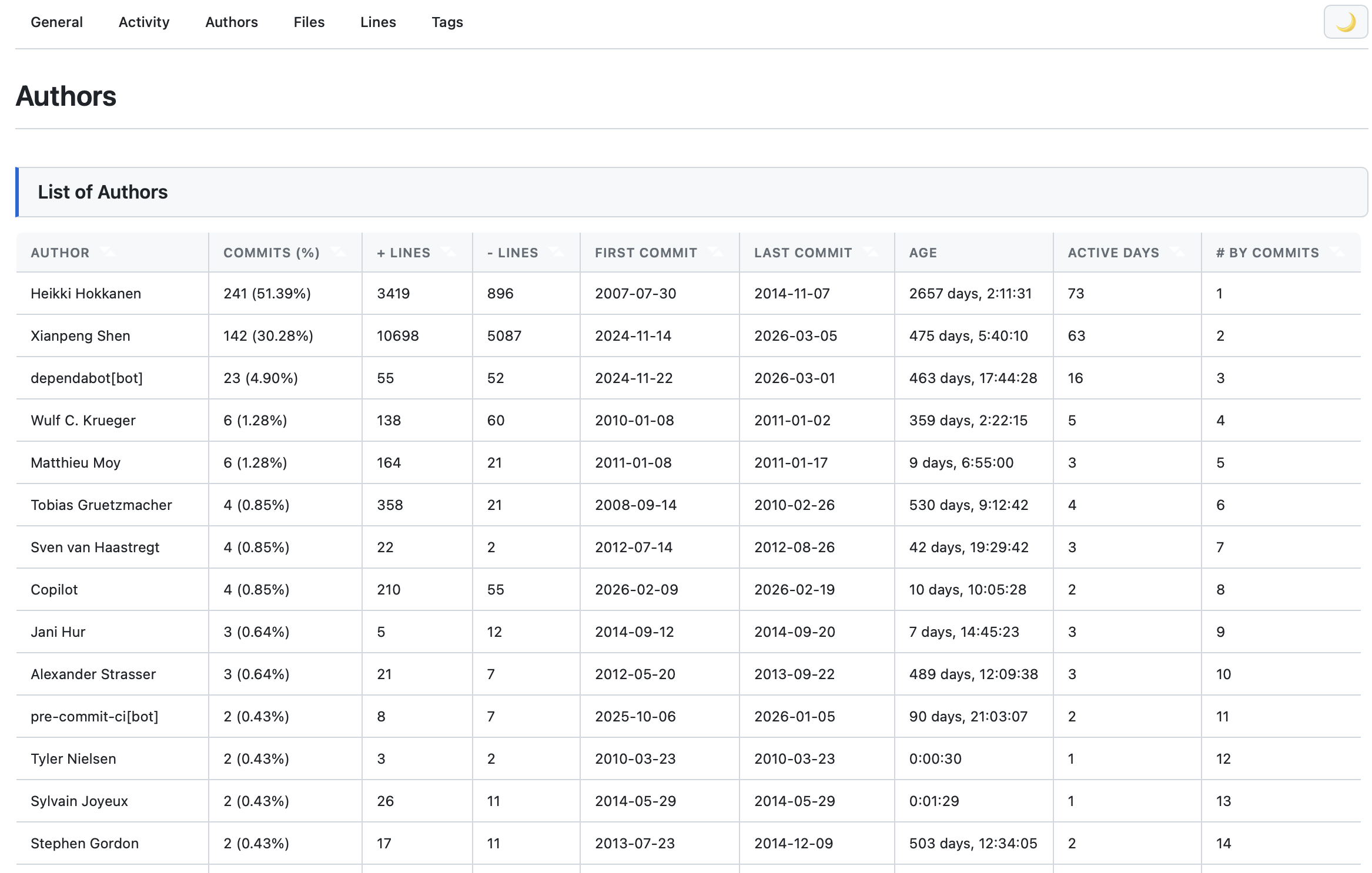 You can visit this online preview to see the actual effect, which is a report generated based on GitStats’ own repository.
