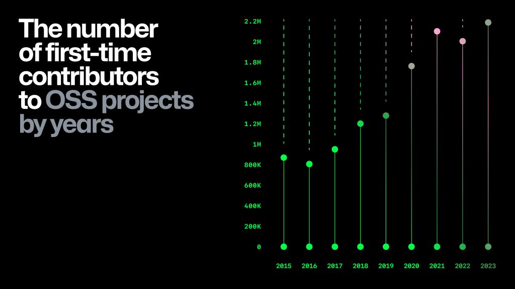 2023 年,首次为开源项目做出贡献的贡献者数量最多。 新的开发人员通过 freeCodeCamp、First Contributions 和 GitHub Education 等计划参与到开源社区中。我们还看到大量开发人员参与了 Google 和 IBM 等公司的在线开源教育项目。