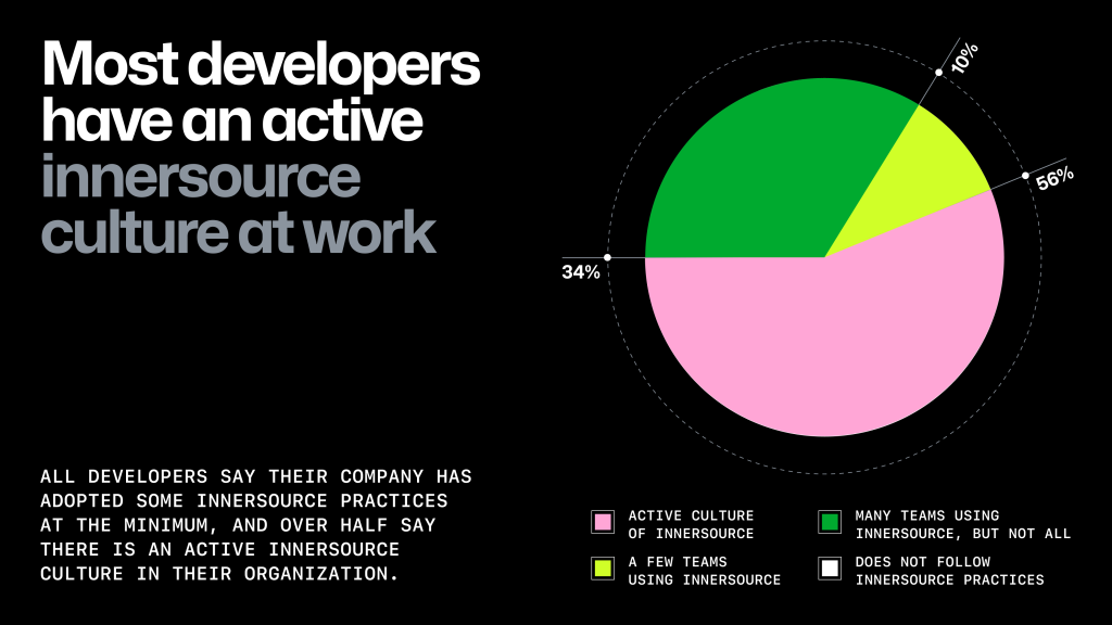 事实上,在最近 GitHub 赞助的一项调查中,所有开发人员都表示他们的公司至少采用了一些内部源实践,超过一半的开发人员表示他们的组织中有活跃的内部源文化。