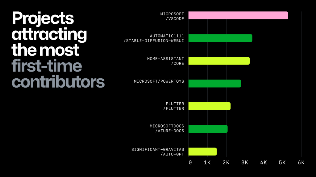 但社区驱动的开源项目(从 home-assistant/core 到 AUTOMATIC1111/stable-diffusion-webui、langchain-ai/langchain 和Significant-Gravitas/Auto-GPT)也见证了首次贡献者的活动激增。这表明,基础模型的开放实验增加了生成人工智能的可及性,为新的创新和更多合作打开了大门。