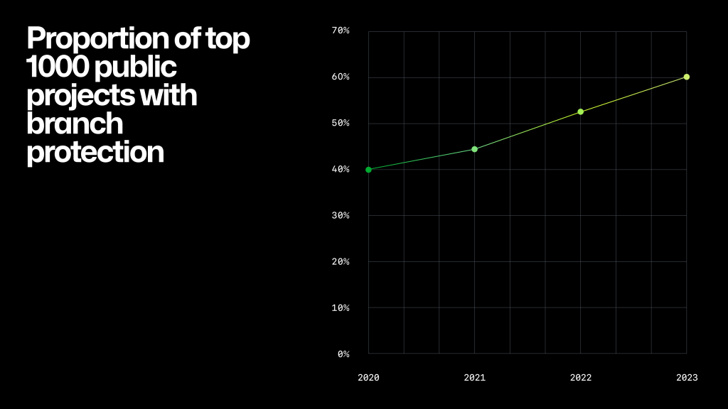 **更多的开源维护者正在保护他们的分支机构。**受保护的分支为维护者提供了更多方法来确保其项目的安全性,我们已经看到超过 60% 的最受欢迎的开源项目 使用它们。自从我们今年早些时候在 GA 中在 GitHub 上推出存储库规则以来,大规模管理这些规则应该会变得更加容易。