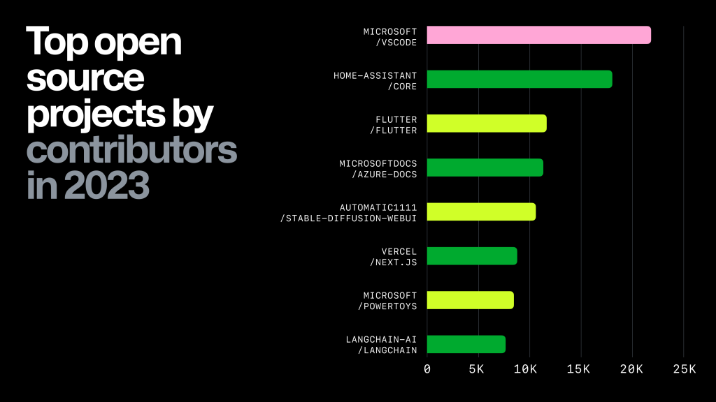 2023 年,开发者为 GitHub 上的开源项目做出了总计 3.01 亿的贡献,其中包括 Mastodon 等热门项目到 Stable Diffusion 和 LangChain 等生成式 AI 项目。